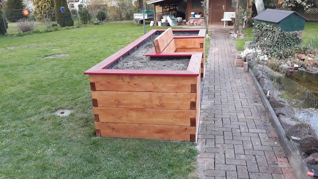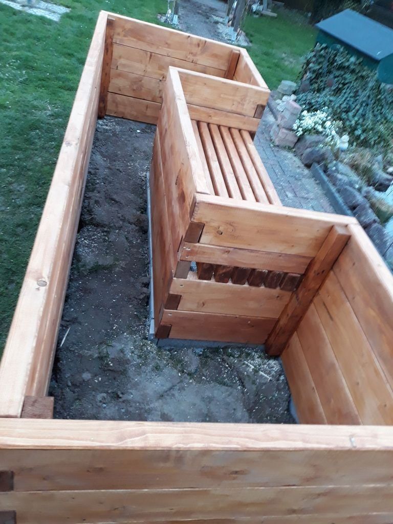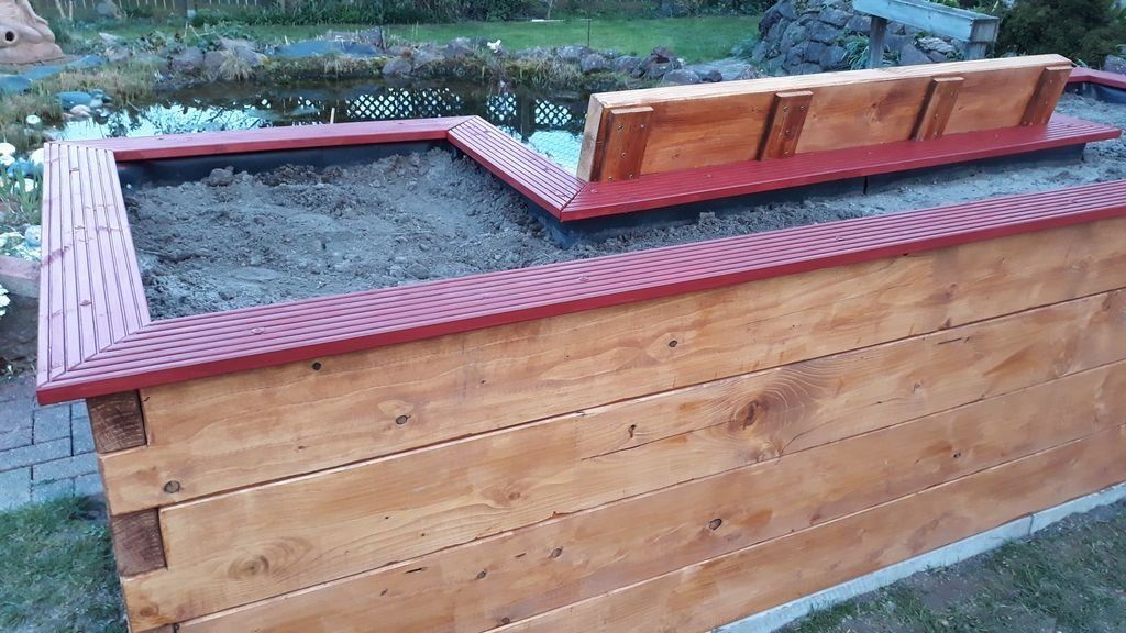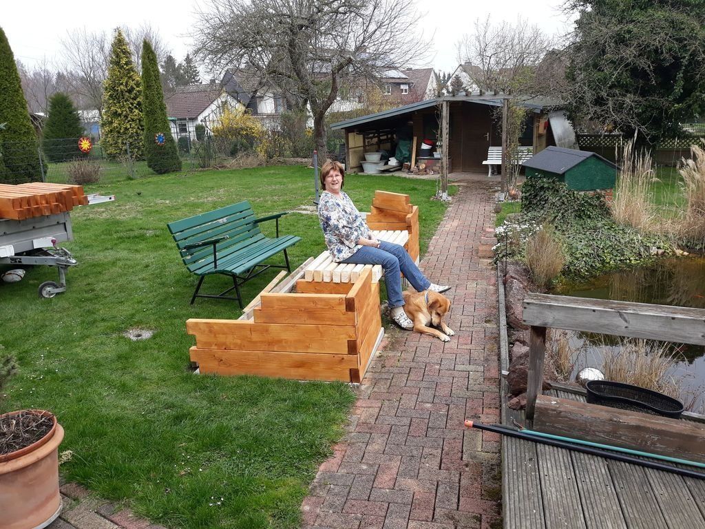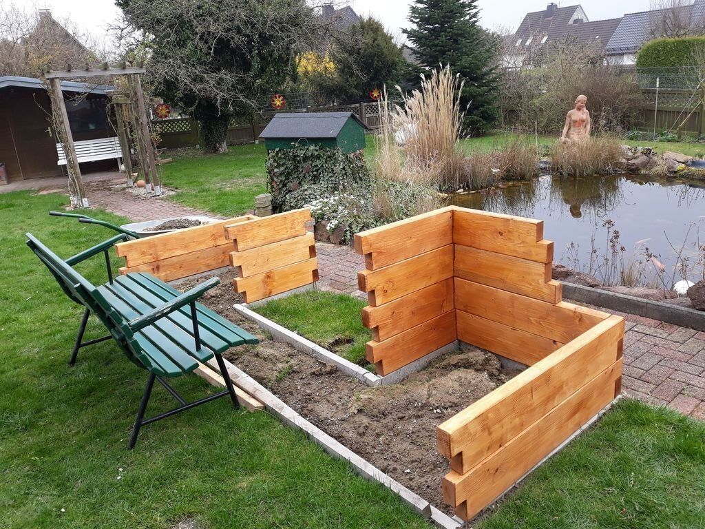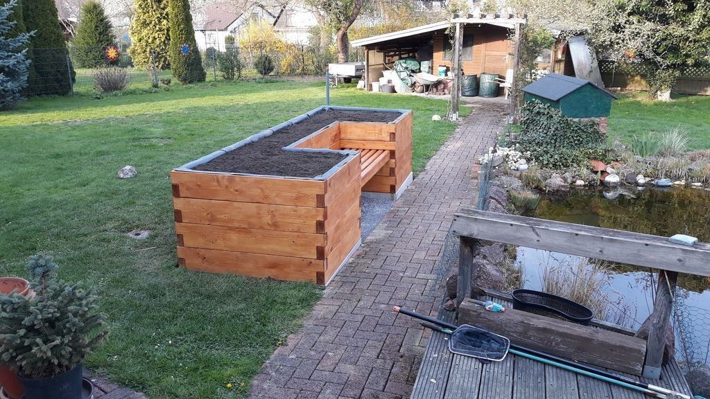 Birgits Wunsch nach einem Hochbeet konnte ich ja nicht einfach so ignorieren und so entstand unter Mitarbeit von Freund Uwe ein Hochbeet nach unseren Maßen. Es musste ja mal was Besonderes sein und so wurde gleich eine Sitzbank zum Gartenteich hin eingebaut.