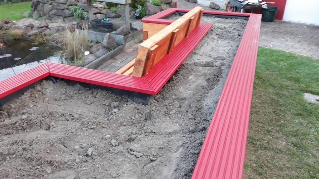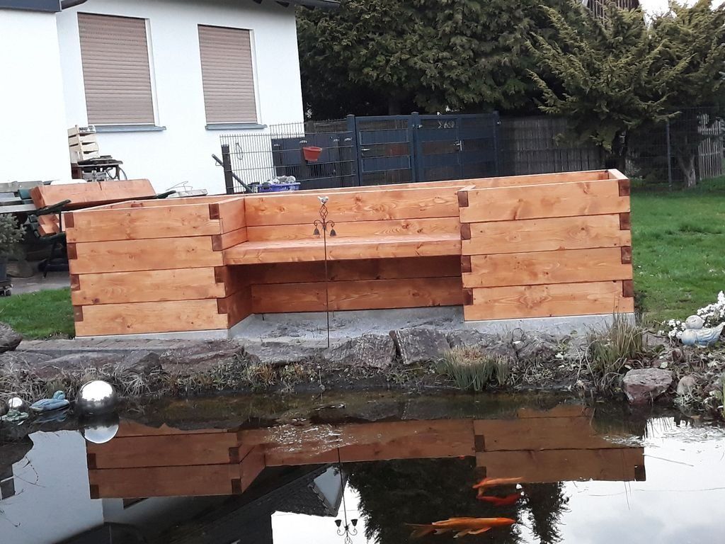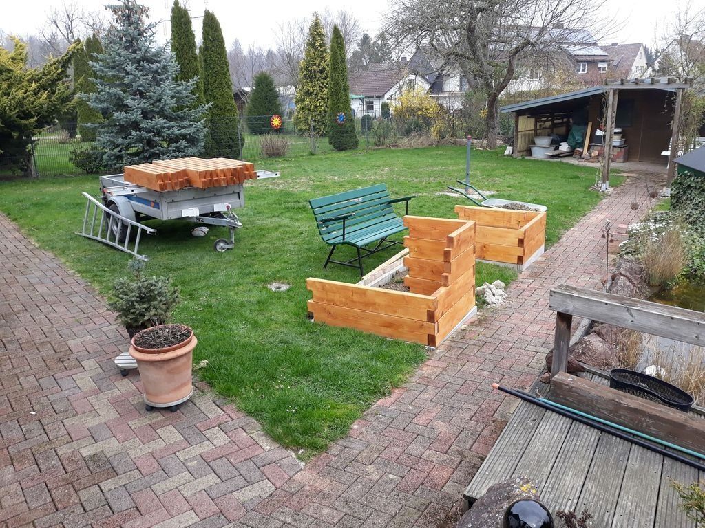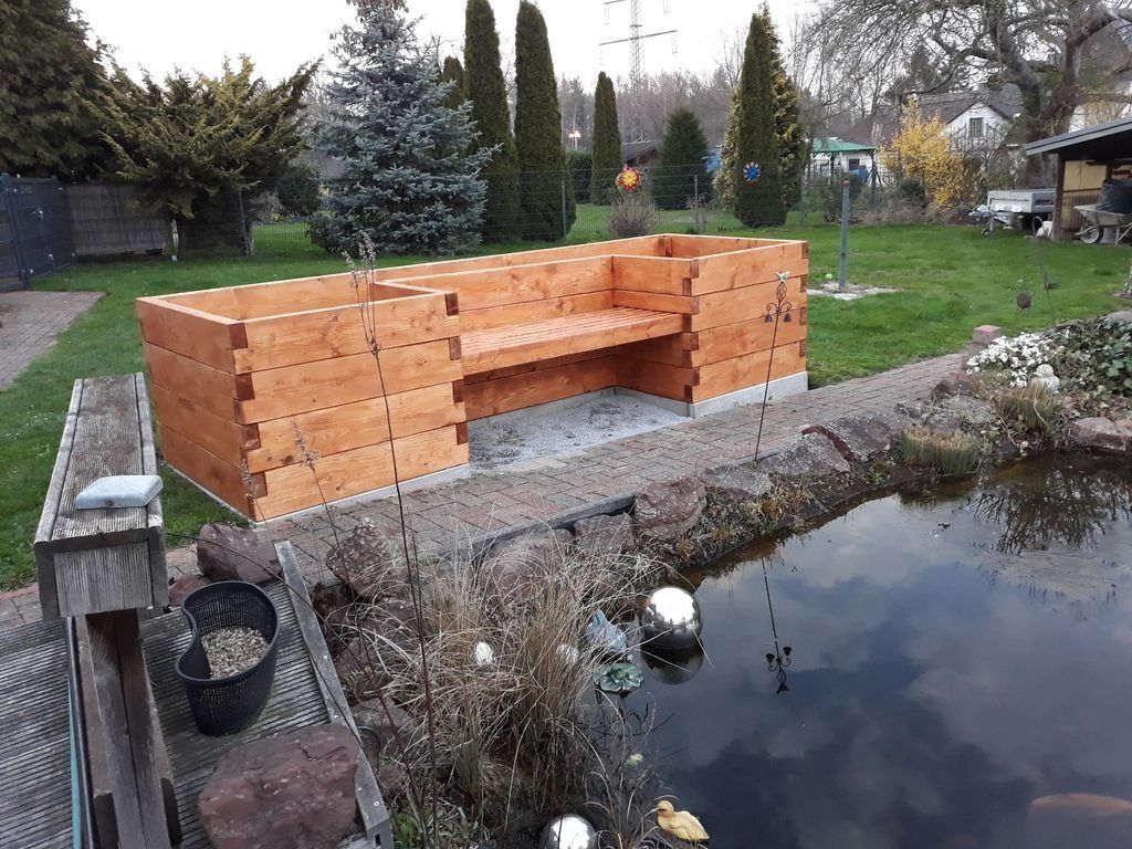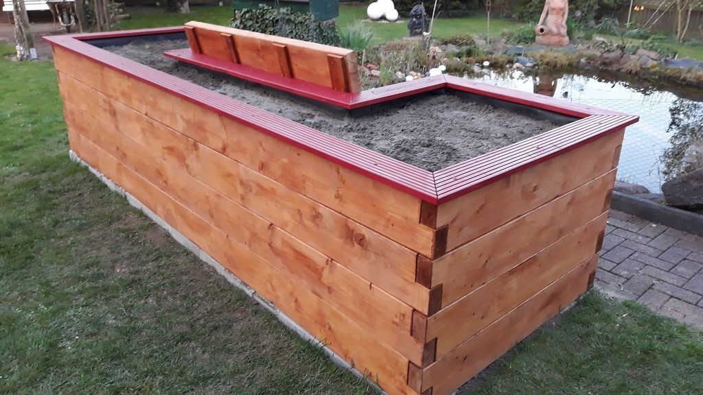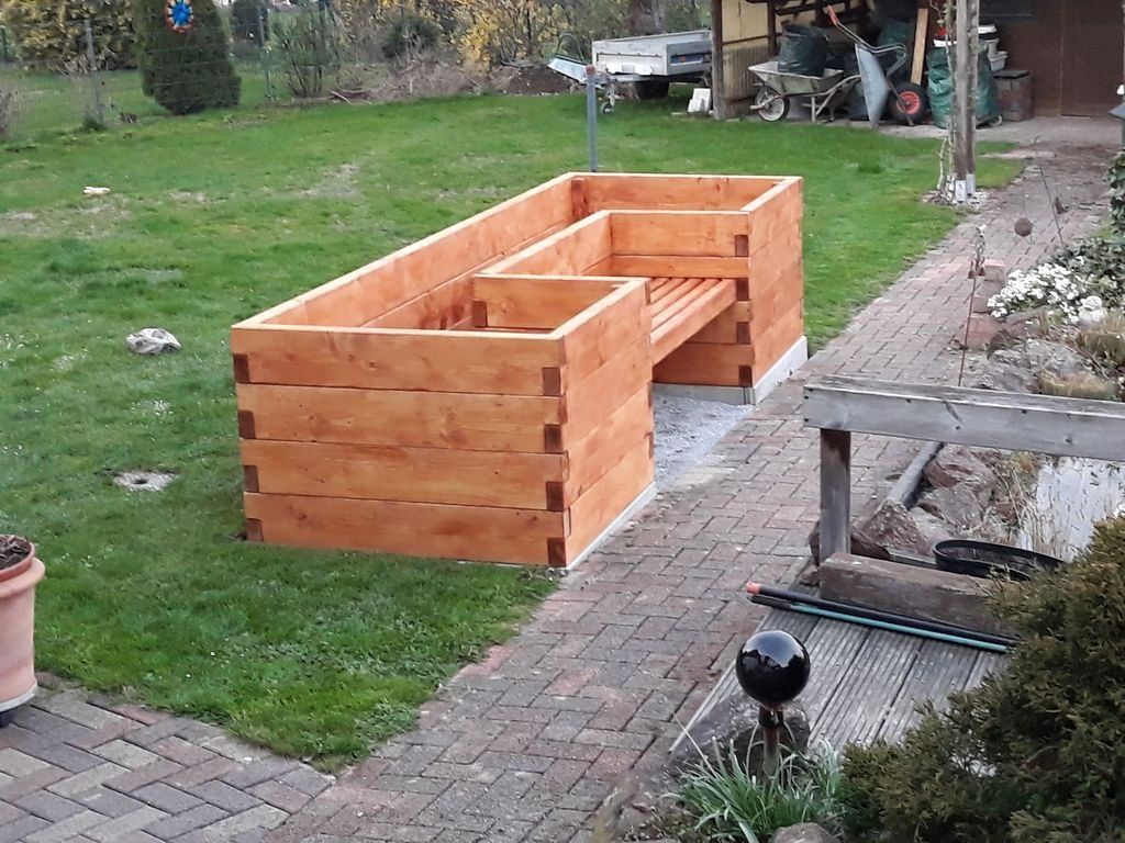 Birgits Wunsch nach einem Hochbeet konnte ich ja nicht einfach so ignorieren und so entstand unter Mitarbeit von Freund Uwe ein Hochbeet nach unseren Maßen. Es musste ja mal was Besonderes sein und so wurde gleich eine Sitzbank zum Gartenteich hin eingebaut.